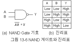반면 NAND 게이트는 모든 입력이 동시에 High이면 출력은 Low가 된다. 그 외의 경우는 출력이 전부 High가 된다. 그림 13-6은 NAND 게이트와 진리표를 보여준다.