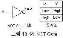 NOT 게이트는 하나의 입력상태에 대해, 하나의 출력 상태만 있으며, 그 상태는 서로 상반된다. 그림 13-14는 NOT 게이트와 진리표를 나타낸다.