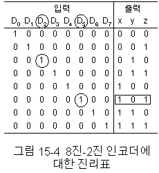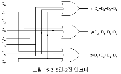 개 이하의 입력선과 n개의 출력선을 가진다. 인코더의 예가 그림 15-3에 있다. 8진-2진 인코더는 8개의 디지트들 각각에 대해 입력이 필요하므로 8개의 입력이 있어야 하며 그 대응되는 2진수를 산출하기 위해 3개의 출력들이 있어야 한다. 즉, 인코더는 코드화기이다. 그림에서 인코더는 OR 게이트들로 구성되는데 OR 게이트들의 입력은 그림 15-4의 진리표로부터 결정된다. 출력 z는 입력 8진 디지트가 홀수이면 "1"이 된다. 출력 y는 입력 8진 디지트가 2, 3, 6, 7이면 "1"이 된다. 또, 출력 x는 입력 8진 디지트가 4, 5, 6, 7일 때 "1"이 된다.
