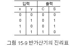 반가산기는 2개의 2진 입력과 2개의 2진 출력으로 구성된다. 입력 변수들은 피가수와 가수를 나타내고 출력 변수들은 합과 캐리를 의미한다. 일반적으로 두 입력을 x, y로, 출력을 S와 C로 부른다. 입력과 출력에 대한 진리표는 표 15-9와 같다.