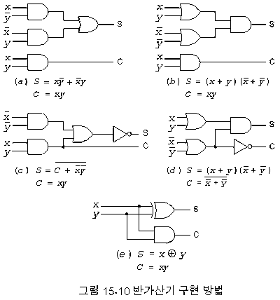 이것을 논리도로 표시한 것이 그림 15-10이며 반가산기에 대한 다른 4가지 논리도들도 그림 15-10에 있다. 이것들은 모두 입력과 출력의 작동에 관한 한 똑같은 결과를 산출한다. 이것을 볼 때 우리는 이와 같은 간단한 조합 논리 함수를 제작할 때 조차 여러가지 다양한 선택이 있을 수 있음을 알 수 있다.
