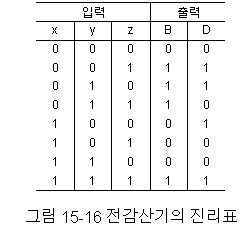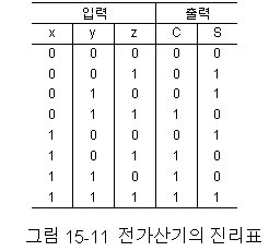 전가산기는 3개의 입력 비트들의 합을 계산하는 조합회로이다. 전가산기는 3개의 입력과 2개의 출력으로 구성된다. x와 y로 표시된 입력 변수들은 더해질 현재 위치의 두 비트이며, z로 표시된 세 번째 입력 변수는 바로 전 위치로부터의 캐리이다. 3개의 비트를 더할 때 합은 0부터 3까지 나올 수 있고, 2와 3을 2진수로 표시하는 데 2개의 디지트가 요구되므로 2개의 출력이 필요하다. 두 출력 중 합에 대해서는 S라는 기호로, 캐리에 대해서는 C라는 기호로 표시한다. 3개의 비트의 합을 계산하여 앞의 디지트는 출력 캐리 C가 되며, 뒤의 디지트가 S로 표시된다. 전가산기의 진리표는 그림 15-11과 같다.