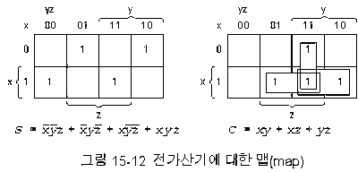 전가산기 회로의 입출력 논리 관계는 각 출력 변수에 대해 하나의 부울 함수가 대응되므로 2개의 부울 함수로 표현될 수 있다. 각 부울 함수를 단순화시키기 위해 맵이 하나씩 필요하다. 각 맵은 출력이 세 입력 변수들의 함수이므로 8개의 사각형들로 구성된다. 그림 15-12에 있는 2개의 맵들은 두 출력 함수들을 각각 단순화하는데 사용한다. 각 맵의 사각형 내에 표시된 1은 진리표로부터 직접 얻을 수 있다. 출력 S의 경우 1로 표시한 사각형들은 인접한 사각형과 결합할 수 없으므로 더 이상 단순화시킬 수 없다. 출력 C는 단순화되어져 6개의 문자로 된 표현을 얻는다. 곱의 합으로 전가산기의 논리도가 그림 15-13에 있다. 이것은 다음 부울 함수 표현을 사용한 것이다.