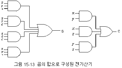 전가산기에 대한 다른 구성을 개발할 수 있다. 합의 적으로 표현할 경우 그림 15-13과 같은 수의 게이트를 사용하지만 AND 게이트와 OR 게이트의 수가 서로 바뀐다.
