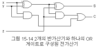 전가산기는 그림 15-14에서처럼 2개의 반가산기와 하나의 OR 게이트로 구현할 수 있다. 두 번째 반가산기의 출력 S는 첫 번째 반가산기의 출력과 z를 Exclusive-OR한 것이다. S와 C는 다음과 같이 부울 함수로 표현할 수 있다.