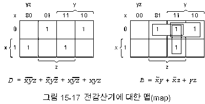 전감산기의 두 출력에 대한 부울 함수들은 그림15-17의 맵에 있다. 이것을 단순화하여 적의 합으로 나타내면 다음과 같다.