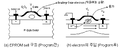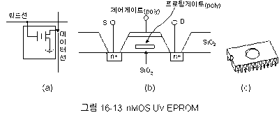 그림 16-10은 nMOS에 의한 EPROM의 구조를 나타낸다. 보통의 제어게이트 외에 프로팅게이트(floating gate)를 가지고 있는 것이 특징이다. 데이터를 써넣을 때에는 제어게이트-드레인 간에 정의 전압을 가하여 소스-드레인 간에 채널을 생기게 하여 전류를 흘린다. 드레인 부근의 공핍층의 전계는 애버런취 항복을 일으킬 정도로 높지 않지만 가속된 전자의 충돌 전이에 의해서 생긴 전자가 제어게이트로부터의 전계에 의하여 프로팅게이트에 주입된다. 프로팅게이트에 전하를 축적한 MOS트랜지스터는 그 부전하에 의하여 통상의 읽어내기 상태(써넣을 때의 고전압이 걸리지 않은 상태)에서는 채널이 형성 안되므로 OFF 상태가 된다. 즉 논리 0이 저장된다. 프로팅게이트는