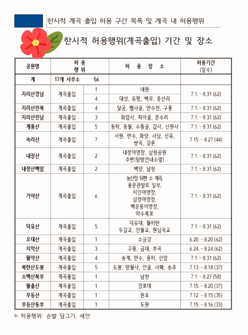 7~8월 계곡 산행ㅡ한시적 허용 행위ㅡ 지리산 국립공원ㅡ 설악산 국립공원 ㅡ속리산 국립공원 내장산 국립공원 ㅡ오대산 국립공원 한라산 ㄱ