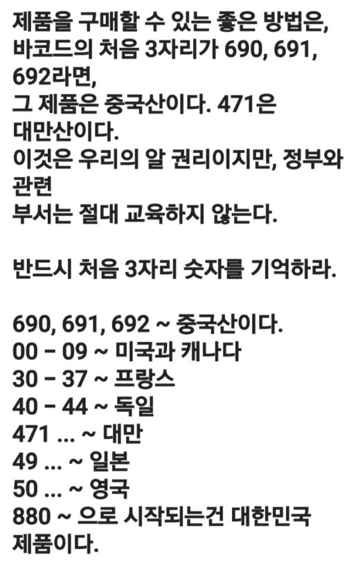 생활정보ㅡ 바코드 읽는 법ㅡ 정말 중요한 정보ㅡ 구매하는 모든 식료품의 라벨을 확인 ㅡ전 세계는 지금 중국산 ㅡ검은마음상품에 대해 우려