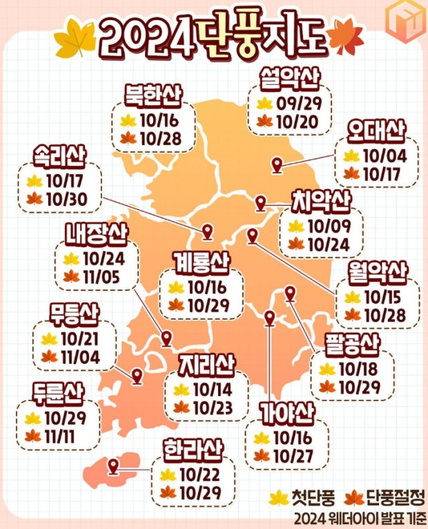 2024 단풍 지도 ㅡ단풍 산행 코스 17ㅡ설악산 국립 공원 ㅡ 지리산 국립 공원 ㅡ내장산 국립공원 ㅡ 오대산 국립공원 ㅡ가야산 국립공