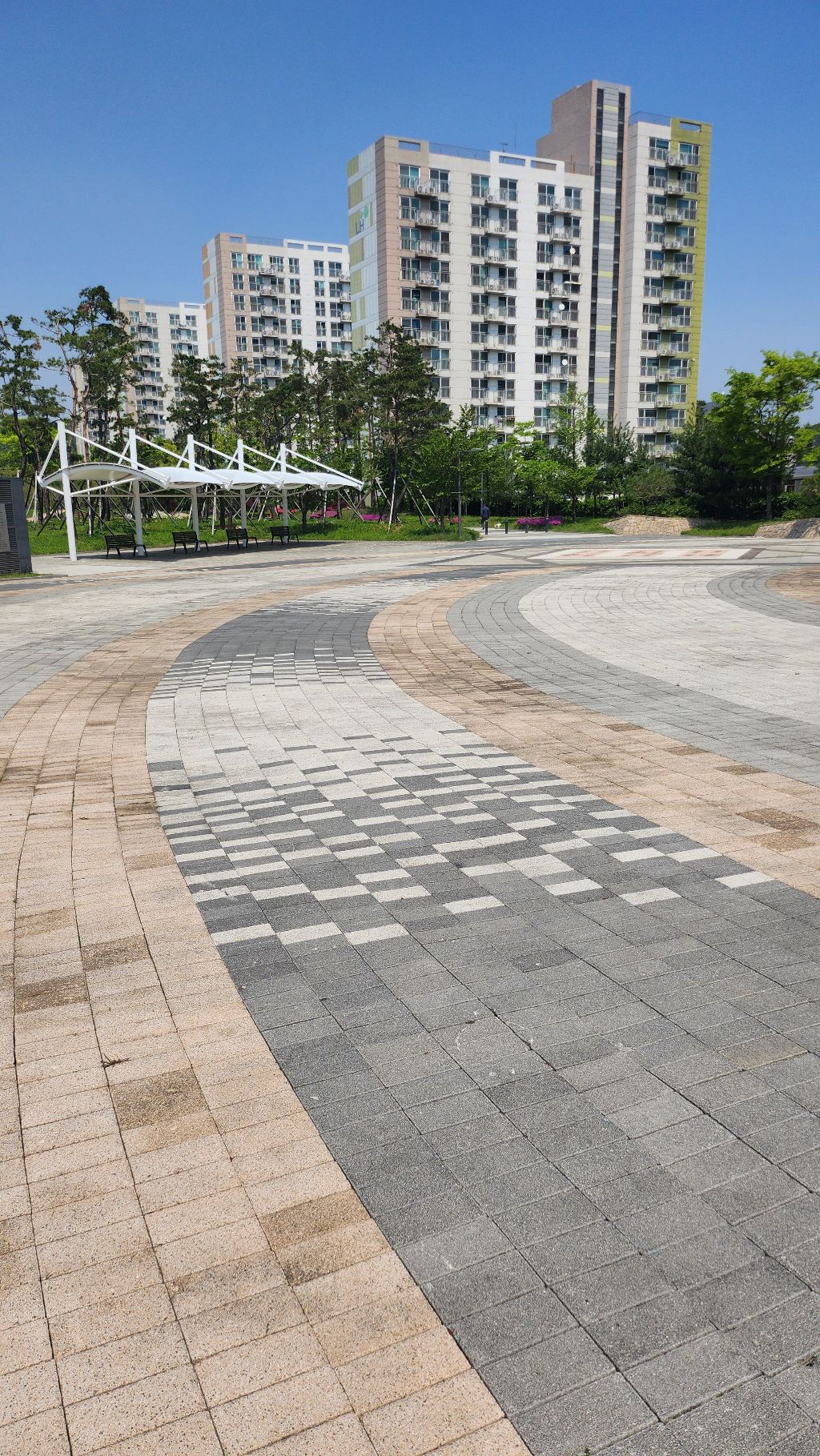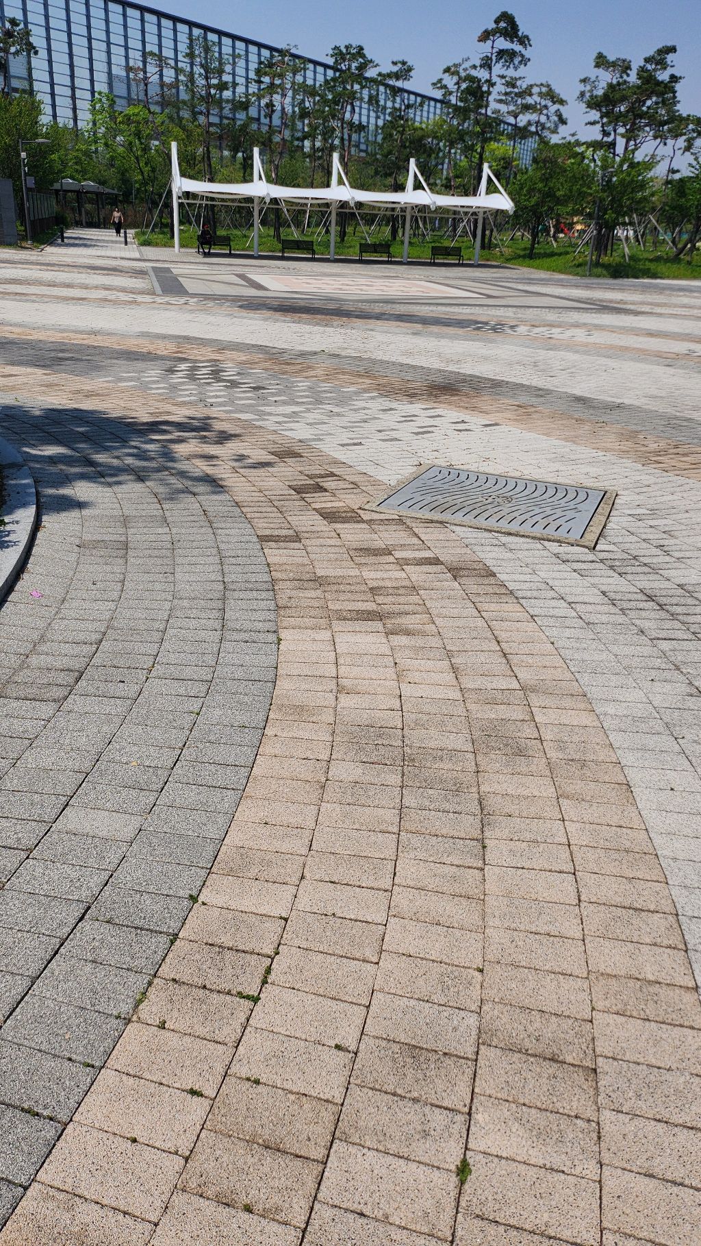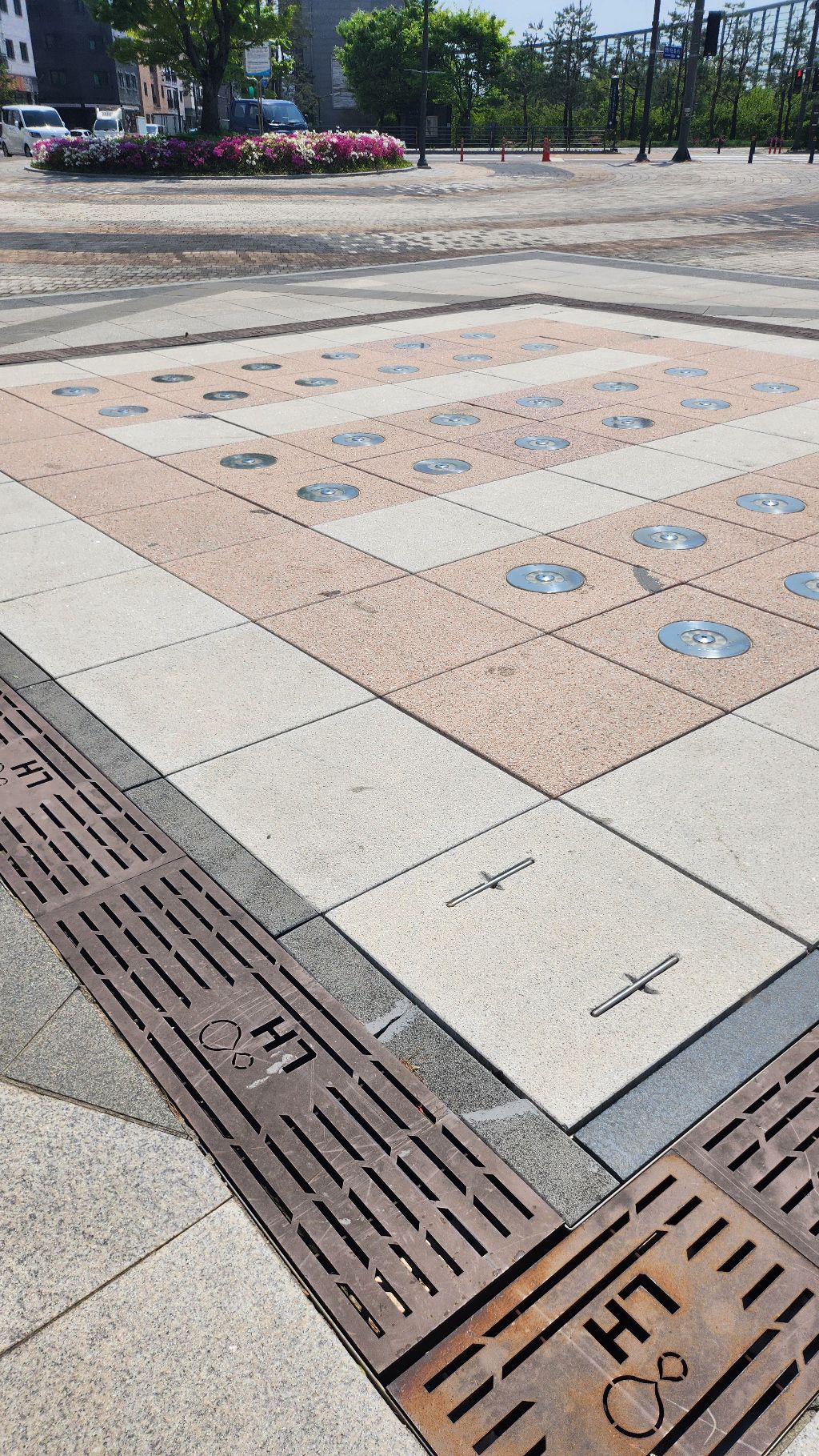 바닥 분수와 잘 정돈된 산책로,
