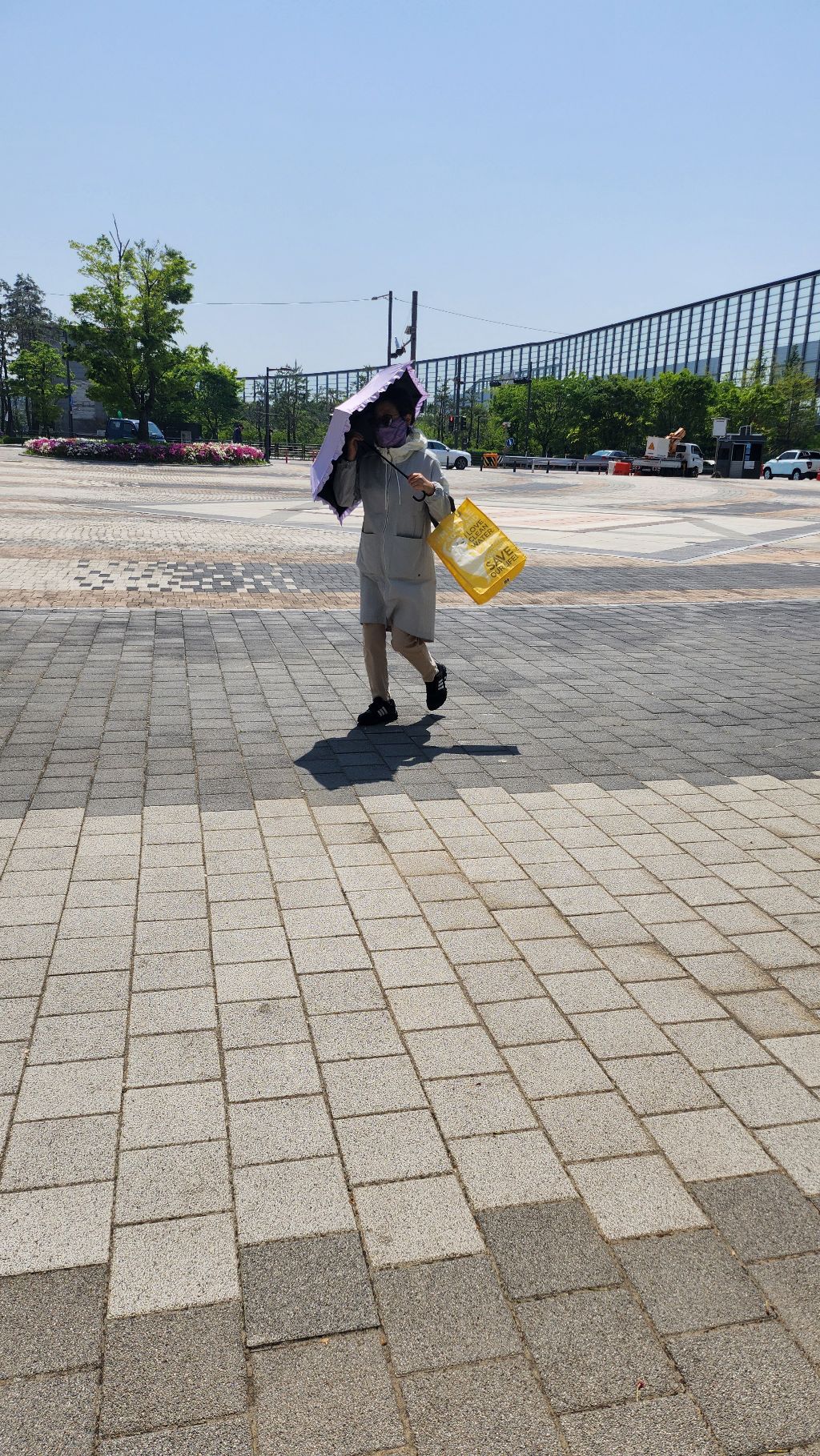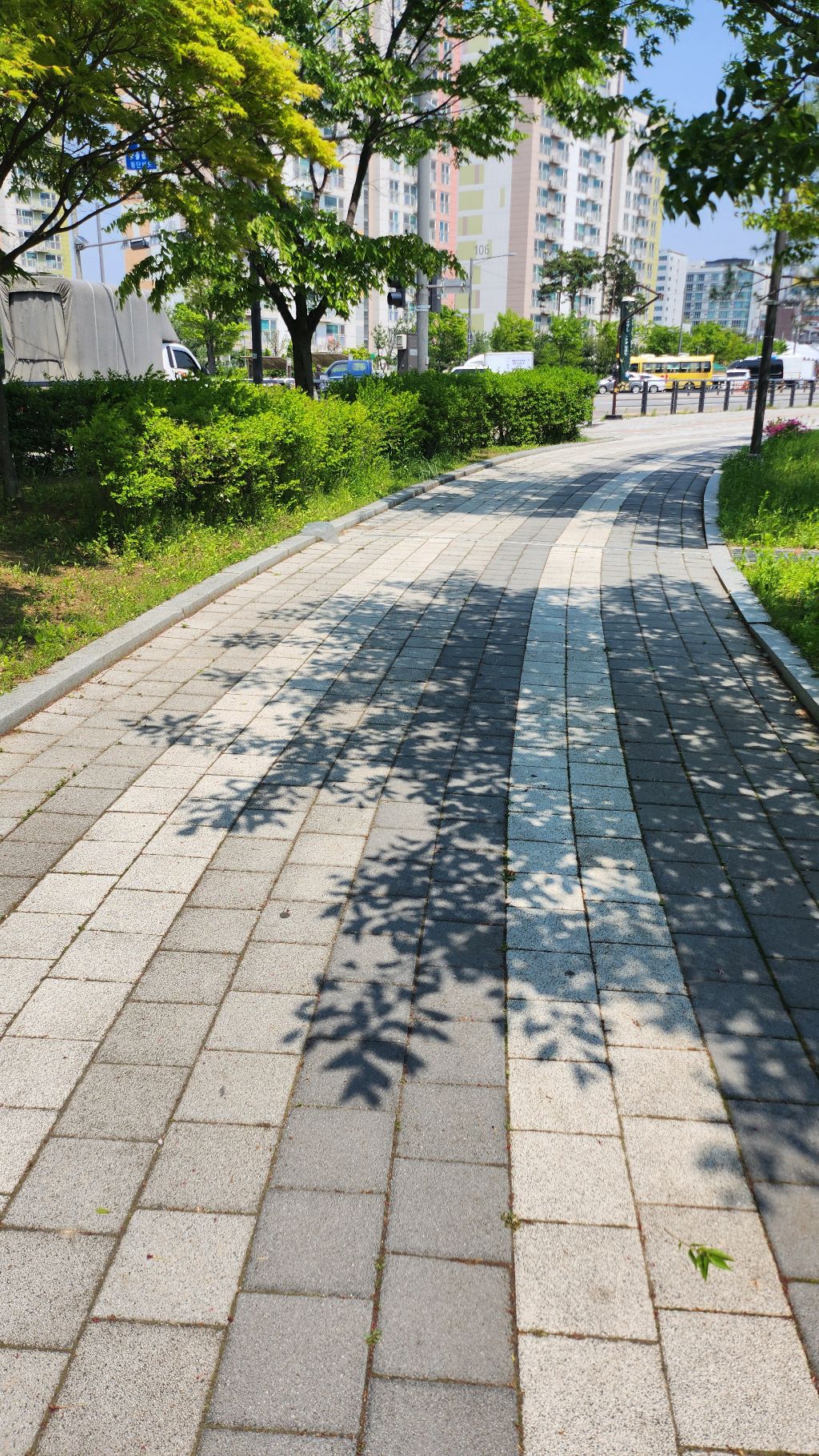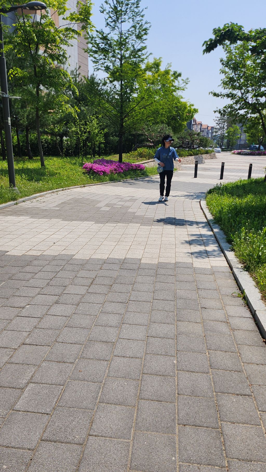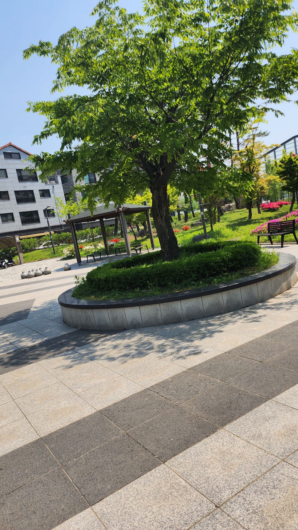 바닥 분수와 잘 정돈된 산책로,
