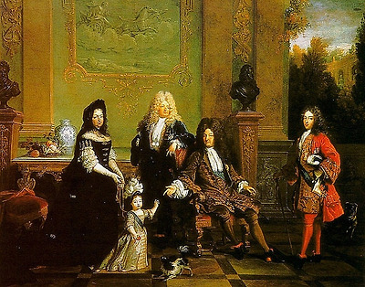 태양왕으로 불리는 루이 14세는 이 시기 유럽에서 가장 행복한 왕으로 스스로를 자축했다. 적자인 왕세자 르 그랑 도팽이 있었고 손자인 부르고뉴 공작 프티 도팽(왕세손)이 1704년 첫 아들 부르타뉴 공작을 낳는다. 루이 14세는 생전 아들, 손자 셋(프티 도팽, 앙주 공작, 베리 공작), 증손자까지 얻은 유럽 최초이자 유일한 국왕이 되어 왕실의 후사를 강건히 하게 된 것이다. 비록 이 때 태어난 브르타뉴 공작은 1년 후 요절에 앙주 공작은 후사가 끊긴 스페인 왕실에서 영구 대여로 빌려가 스페인 국왕이 되어 프랑스를 떠나지만 곧 1707년 새 브르타뉴 공작 루이가, 1710년 새 앙주 공작(훗날의 루이 15)이 태어난다. 루이 14세, 그랑 도팽, 프티 도팽, 브르타뉴 공작 4대가 모여있는 이 초상화는 루이 15세가 될 앙주 공작이 태어난 1710년 그려졌다.