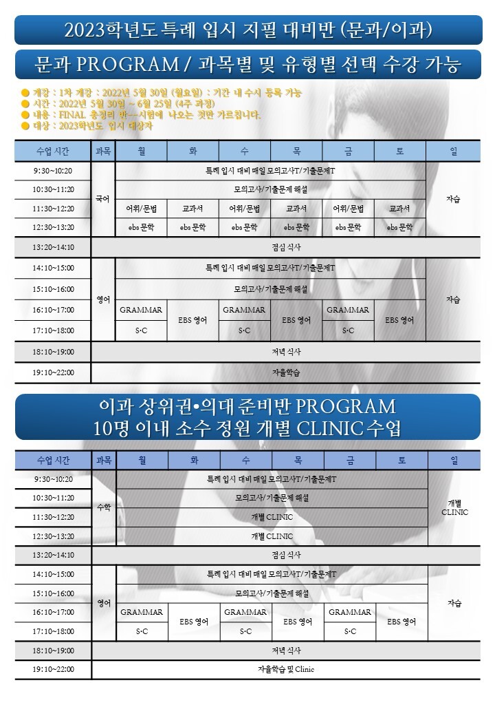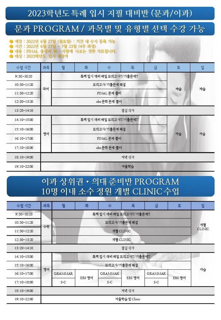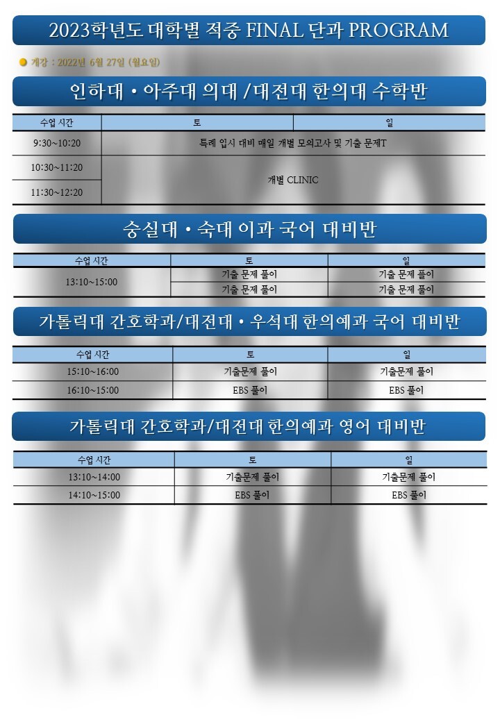 2023학년도 특례전문가집단 쌤특례학원 12학년 지필 파이널반 / 컨설팅 / 자소서 수업 안내 작성자푸른하늘|작성시간22.05.02|조회수282 목록 댓글 0 글자크기 작게가 글자크기 크게가 2022-여름 고3.pdf2.33MB 첨부파일첨부된 파일이 7개 있습니다. etc 파일 슬라이드3.JPG 다운로드 etc 파일 슬라이드2.JPG 다운로드 etc 파일 슬라이드4.JPG 다운로드 etc 파일 슬라이드5.JPG 다운로드 etc 파일 슬라이드6.JPG 다운로드 etc 파일 슬라이드1.JPG 다운로드 pdf 파일 2022-여름 고3.pdf 다운로드 다음검색 현재 게시글 추가 기능 열기 북마크 공유하기 신고 센터로 신고 댓글 댓글 0 댓글쓰기 답글쓰기 댓글 리스트