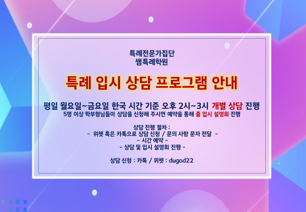 쌤특례학원 특례 입시 상담 안내 작성자푸른하늘|작성시간22.07.19|조회수759 목록 댓글 0 글자크기 작게가 글자크기 크게가 다음검색 현재 게시글 추가 기능 열기 북마크 공유하기 신고 센터로 신고 댓글 댓글 0 댓글쓰기 답글쓰기 댓글 리스트