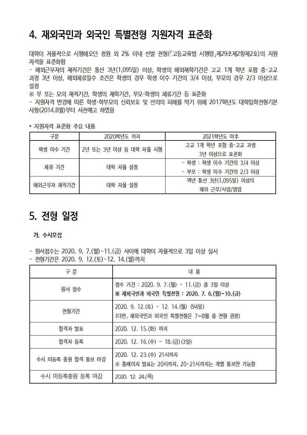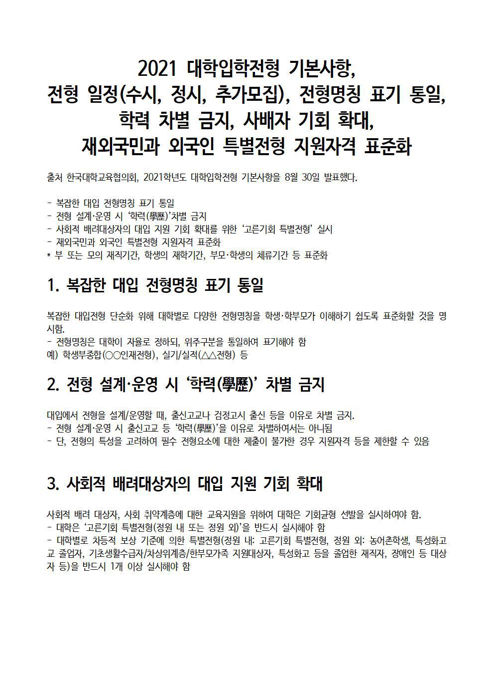 2021 대학입학전형 기본사항, 전형 일정(수시, 정시, 추가모집), 전형명칭 표기 통일, 학력 차별 금지, 사배자 기회 확대, 재외국민과 외국인 특별전형 지원 작성자푸른하늘|작성시간19.09.24|조회수875 목록 댓글 0 글자크기 작게가 글자크기 크게가 다음검색 현재 게시글 추가 기능 열기 북마크 공유하기 신고 센터로 신고 댓글 댓글 0 댓글쓰기 답글쓰기 댓글 리스트