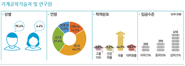 한국고용정보원의 「2013-2023 인력수급전망」에 따르면, 2013년 기계공학기술자 및 연구원 취업자 수는 115,100명으로 2008년 65,200명 대비 49,900명(연평균 12.0%) 증가하였다.