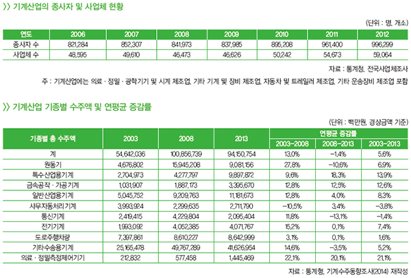 기계산업은 2003~2008년 동안 연평균 13.0%의 고성장을 하였으나, 2008~2013년 동안은 연평균 -1.4%의 하락률을 보였다. 2008-2013년의 마이너스 성장은 2008년에 시작된 세계 금융위기의 여파로 2009년도의 해외수주액이 전년도에 비해 1/3 수준으로 급감한 것이 반영된 것이며, 2009년 이후 다시 회복하기 시작하여 2013년에는 정점에 이르렀던 2007-2008년 수준에 근접하였다.