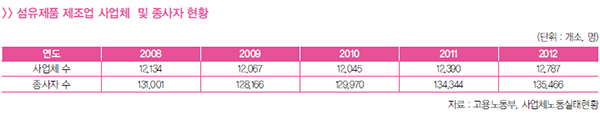 섬유제품 제조업 사업체 수와 종사자 수 현황을 보면 사업체와 종사자 모두 2008년에 비해 2012년 소폭 증가하였다.
