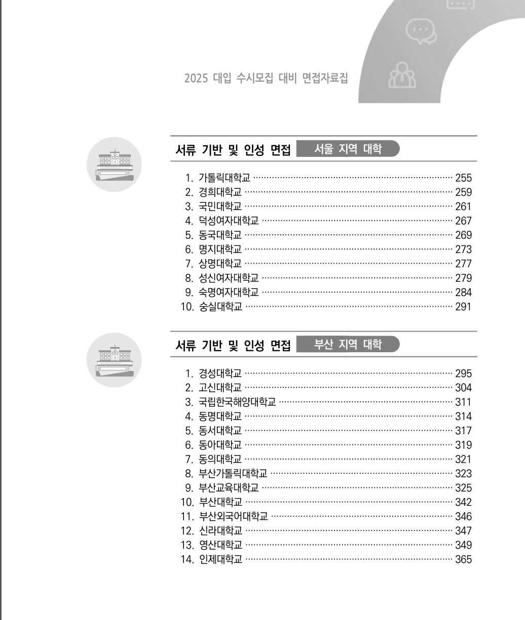■ 2025학년도 수시 면접 자료집 출처 : 부산광역시교육청 작성자푸른하늘|작성시간24.09.17|조회수176 목록 댓글 0 글자크기 작게가 글자크기 크게가 ■ 2025학년도 수시 면접 자료집출처 : 부산광역시교육청 2025대입_수시_수시모집 대비 면접자료집_부산광역시교육청(2024년 8월)_2024_09_17_11_12_26.pdf9.97MB 첨부파일첨부된 파일이 4개 있습니다. jpg 파일 대학 합격의길(진로, 진학, 학습, 입시)_사진_20240917_2.jpg 다운로드 jpg 파일 대학 합격의길(진로, 진학, 학습, 입시)_사진_20240917_3.jpg 다운로드 jpg 파일 대학 합격의길(진로, 진학, 학습, 입시)_사진_20240917_1.jpg 다운로드 pdf 파일 2025대입_수시_수시모집 대비 면접자료집_부산광역시교육청(2024년 8월)_2024_09_17_11_12_26.pdf 다운로드 다음검색 현재 게시글 추가 기능 열기 북마크 공유하기 신고 센터로 신고 댓글 댓글 0 댓글쓰기 답글쓰기 댓글 리스트