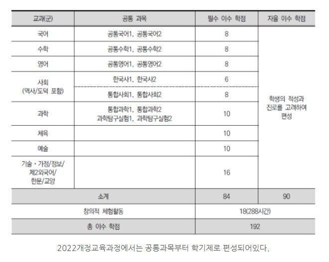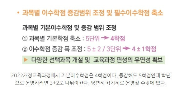 하지만 고교학점제는 1학년 공통과목부터 학기제 운영을 원칙으로 하고있습니다. 과목체제 개편도 학기제 운영을 염두에 두고 바뀌었거든요. 2022개정 교육과정의 기본이수학점이 4학점이고 최대 5학점입니다. 5학점을 쪼개서 1,2학기로 나누어 가르치기는 어렵습니다. 따라서 한 학기에 수업을 마쳐야하는 겁니다. 지금은 공통과목은 최대 8학점, 선택과목은 7학점까지 운영이 가능했어요. 그래서 1학년 국영수는 1학기 4학점, 2학기 4학점으로 운영해왔고, 확통이나 사탐, 과탐은 1학기 3학점, 2학기 3학점으로 1년과정으로 운영해왔어요. 그러나 이제는 불가능합니다. 최대 학점이 5학점을 넘길수 없기 때문이에요.