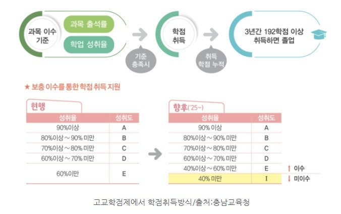 2025년 고1(09년생)부터는 크게 달라지는게 있어요. 우선 모든 선택과목의 평가가 절대평가(성취도 평가)로 바뀝니다. 또 과목별 학업 성취율이 40%(100점 만점에 40점 미만)미만이면 미이수가 되어 별도의 보충 프로그램에 참여하여 이수학점(E)을 취득해야합니다.