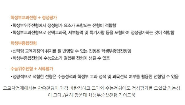 2028년 이후의 대입에서는 학생부의 중요성이 커질 것입니다. 그 이유는 고교학점제에 가장 잘 맞는 입시전형이 학생부 종합전형이기 때문입니다. 고교학점제는 학생들이 자신의 진로와 적성에 맞게 다양한 선택과목을 이수하여 학점을 취득하는 제도에요. 그래서 선택과목의 평가도 절대평가로 바뀌는 것입니다.