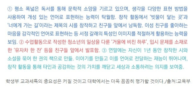 2024년도 대입부터 자소서가 폐지되고 학생부 반영요소가 축소되었어요. 학생부 종합전형에서 가장 중요한것이 교과성적과 교과이수현황 그리고 교과 세부능력 특기사항입니다.