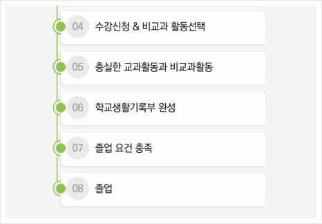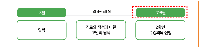 ○과목 선택은 1학기 말~ 2학기 초에 다음 학년 수강 과목 신청을 하게 됩니다. 즉 7월이면 2학년 선택 과목을 수강신청해야 합니다. 학년말이 아니라 7~8월 사이에 수강신청이 완료되기 때문에 1학기 중에 상담하시기 바랍니다. 미리 진학할 계열과 학과를 자신의 진로적성에 맞춰서 준비해 놓아야 합니다.
