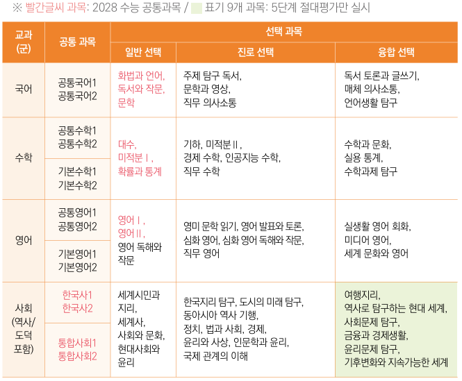 선택과목은 진로와 융합선택으로 나뉩니다. 자신이 더 공부하고 싶은 과목이 선택의 첫 번째 포인트이고, 그 다음은 아무래도 수강생 수가 되겠죠. 일반선택에서는 빨간 색으로 적혀있는 과목들이 '수능'에서도 배우는 과목들입니다. 아무래도 선택할 때 수능까지 대비해야 하니 우선 순위가 될 것입니다.