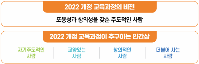 22교육과정의 비전은 '포용성과 창의성을 갖춘 주도적인 사람'이고, 인간상은 자기주도적인, 교양있는, 창의적인, 더불어 사는 사람인데, 비전과 인간상에서 함께 강조되는 건 바로 '자기주도적이며 창의적이고 타인을 배려하는 사람'이라는 것을 알 수 있습니다. 뭐 공자 말씀 같지만 이제 인재상이 달라지는만큼 눈여겨 봐야 합니다. 각 대학들도 이 교육과정의 내용을 평가에서 참고하기 때문이지요.