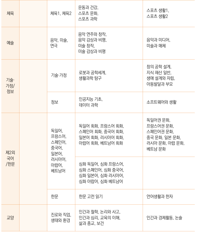 아래 과목들은 수능 출제과목도 아니고 그리 중요한 과목이 아니지만 졸업을 위한 192학점을 구성할 때 선택해야 합니다. 컴퓨터공학과 등을 가고 싶어하는 학생들의 경우엔 '기술과정과 정보' 과목을, 심리학과나 철학과의 경우는 교양 교과에 신경쓰세요. 언론정보 학과의 경우 '미디어의 이해' 같은 과목이 좀 개설되었으면 했는데 없네요..