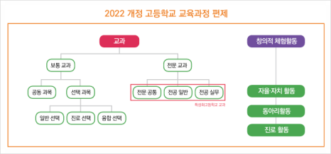 ○2022 개정 교육과정 편제는 교과와 창의적 체험활동으로 나뉩니다. 교과에서는 선택과목 중에 '융합 선택' 분야가 추가되었죠. 창의적 체험활동에서 봉사활동은 빠지고, 자율활동 → 자율자치활동으로 바뀌었습니다.