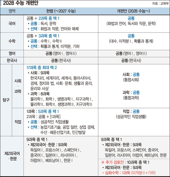 진로선택에서는 기하와 미적분Ⅱ, 윤사, 심화영어, 독작 등이 있고, 정치와 경제가 별도 과목으로 분류되어 있습니다. 사회문화와 생활과윤리는 빠졌고 (윤사와 중복과목이었음), 사회문화도 너무 포괄적이라 잘 빠졌다고 생각함. 수능에 나오지 않아도 바로 이 진로선택과목을 잘 골라야 대학에서 원하는 '진로'역량의 평가를 받을 수 있습니다. 융합선택은 진로선택으로 미진했을 때 선택하게 되는건데... 크게 영향을 끼치지는 않을 것입니다. 국·수·영 공통과목에서 영어 독해와 작문 외는 모두 수능 지정 과목입니다.