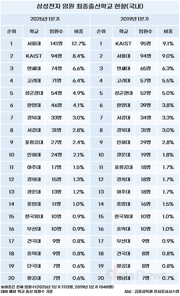 2025 삼성전자 임원 출신대학 순위 (최신 update) 작성자푸른하늘|작성시간25.11.12|조회수229 목록 댓글 0 글자크기 작게가 글자크기 크게가 다음검색 현재 게시글 추가 기능 열기 북마크 공유하기 신고 센터로 신고 댓글 댓글 0 댓글쓰기 답글쓰기 댓글 리스트