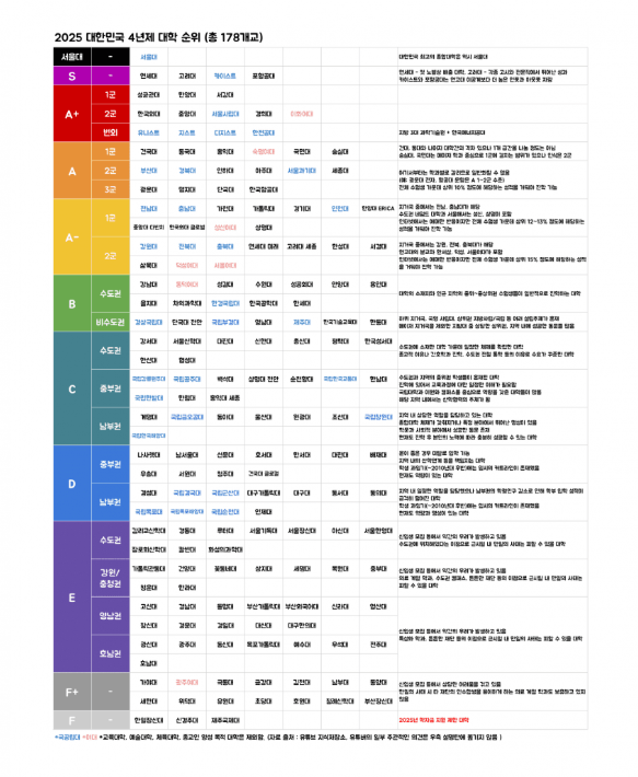 2025 대한민국 4년제 대학 순위 (총 178개교) 작성자푸른하늘|작성시간25.12.17|조회수57 목록 댓글 0 글자크기 작게가 글자크기 크게가 다음검색 현재 게시글 추가 기능 열기 북마크 공유하기 신고 센터로 신고 댓글 댓글 0 댓글쓰기 답글쓰기 댓글 리스트