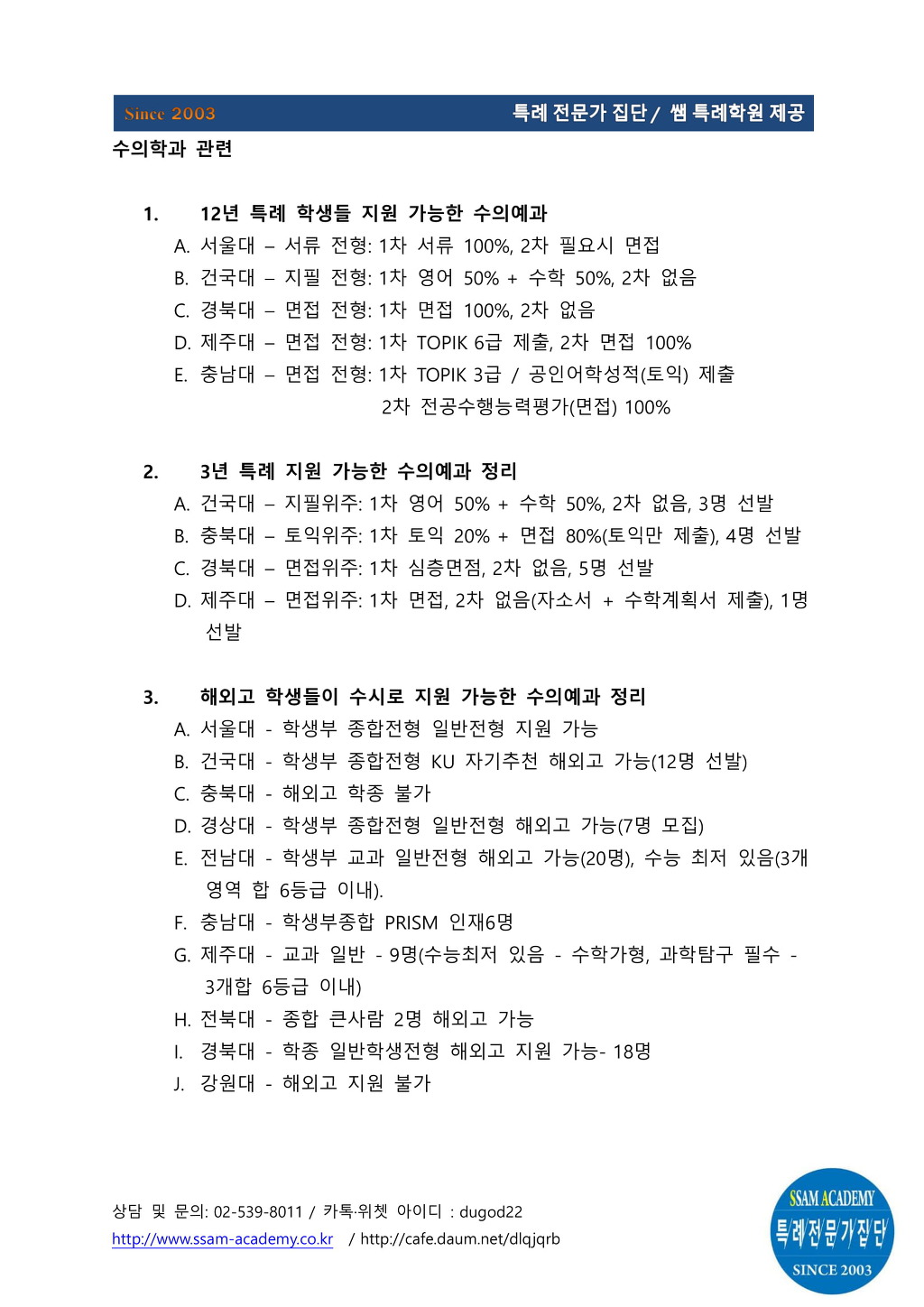 최근들어 수의예과에 진학하고자 하는 학생들의 상담이 많이 늘었습니다. 그래서 해외고 출신으로서 지원 가능한 수의예과를 정리해 보았습니다.