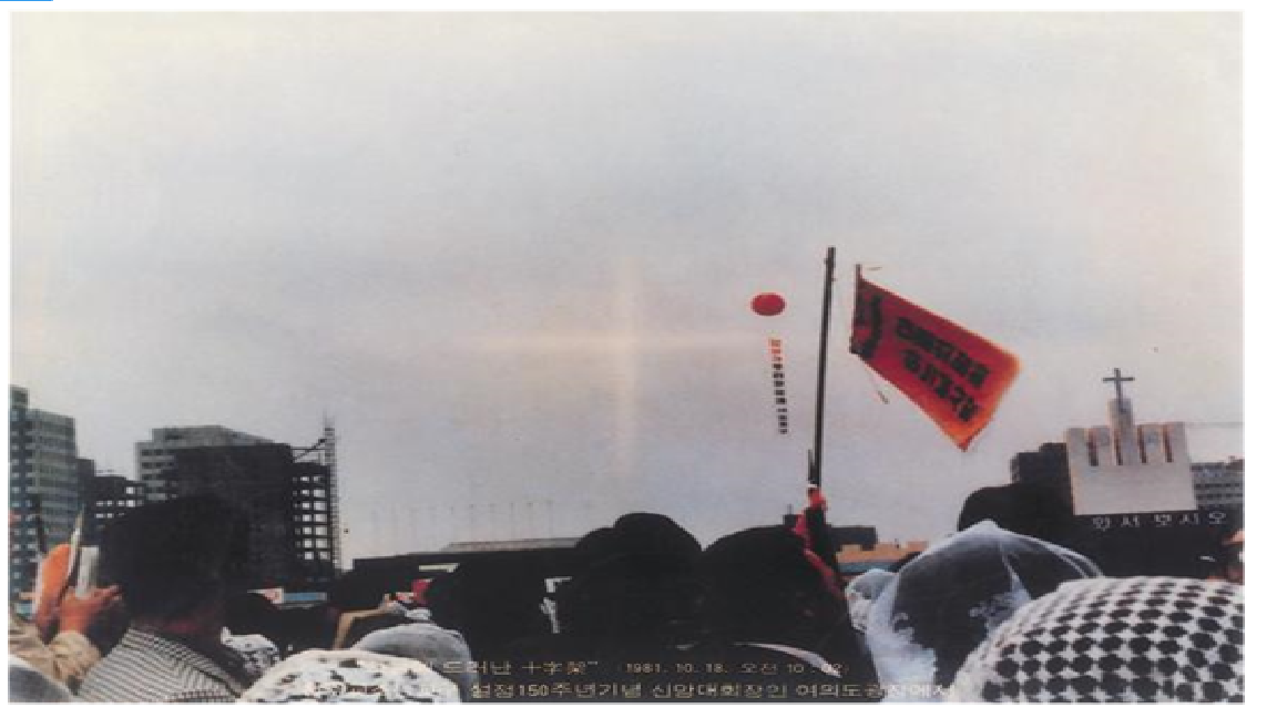 1981년 10월 18일 오전 10시 2분, 서울 여의도광장에서 거행되는 천주교 조선교구설정 150주년기념 신앙대회장에서 하늘에 나타난 십자가를 본 많은 사람들은 깜짝 놀랐습니다.