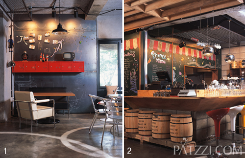 1 노출된 시멘트 벽화와 에폭시 바 닥이 잘 어울리는 커피 프린스 1호점 내부. 레드 컬러의 철제 수납장으로 포인트를 주었다. 미스 사이공 조명 모조품과 의자는 모두 을지로에서 구입한 것. 오래된 TV는 황학 동 벼룩시장에서 구입했다. 목각 인형은 인터 아프리카 제품. 2 카페의 바 풍경.
