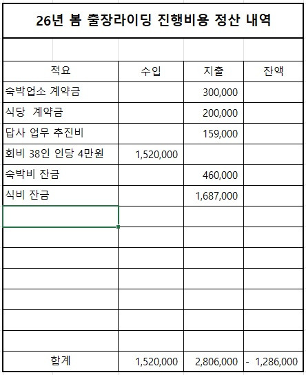26년 4월 13~14일 원정 라이딩 진행비용 정산 내역 작성자은짱|작성시간26.04.14|조회수145 목록 댓글 13 글자크기 작게가 글자크기 크게가 다음검색 현재 게시글 추가 기능 열기 북마크 공유하기 신고 센터로 신고 댓글 댓글 13 댓글쓰기 답글쓰기 댓글 리스트 작성자목련1 | 작성시간 26.04.14 총무님!고생하셨읍니다.복받으세요. 작성자잔디. | 작성시간 26.04.14 봉사는아무나 할수 없는겨ㅎ애쓰셨어요감사^^♡ 작성자비바체1 | 작성시간 26.04.15 new 고생하셨습니다.총무님! 작성자오뚝 | 작성시간 26.04.15 new 그누구보다 더 잘알고 있습니다 열정 절약 관리 감사 합니다 작성자인슈기 | 작성시간 26.04.15 new 은짱 총무님 수고많으셨씁니다~ 댓글 전체보기