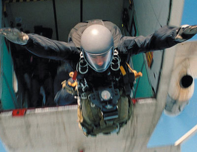 그런 다음 고도 8,000m에서 산개(낙하산을 폅니다.) 물론 고고도에서 낙하를 하면 산소가 희박하여 호흡하는데 매우 어려우므로 반드시 산소마스크를 착용해야 합니다. 그런 후 고도약 3,000m까지 산소 마스크를 사용하고, 강하율을 조정하여 착지 직전에 낙하산의 속도를 늦추어 지상에 착지합니다. 서서 착지합니다.