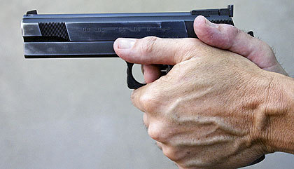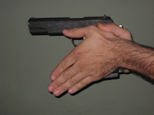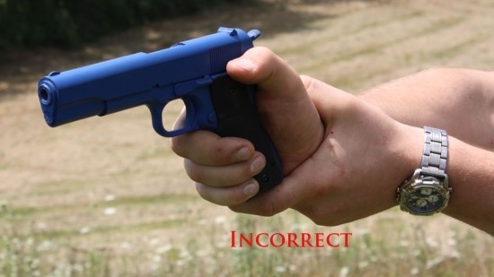 'Corssed Thumb'방식으로 리볼버 사격시에는 적합하나, 자동권총 사격시에는