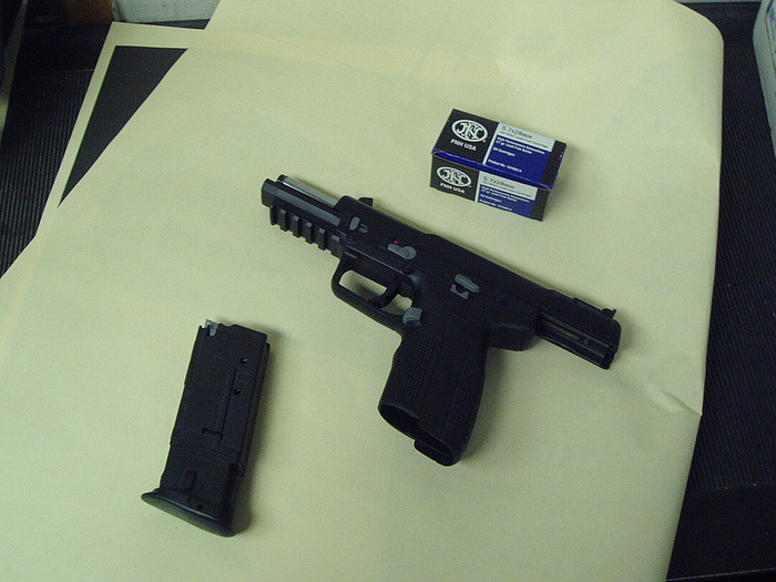 [FN57와 탄창사진. 탄창은 외부는 고강도 플라스틱이지만 내부는 철판 프레스 구조인지라 의외로 가벼우면서도 튼튼하다]