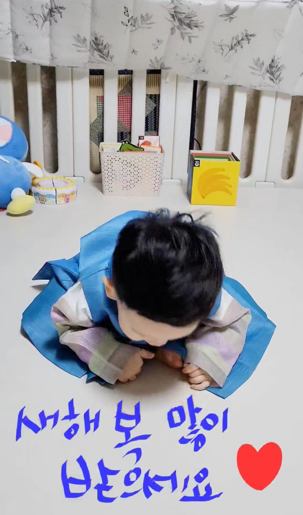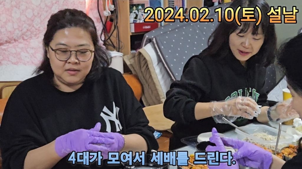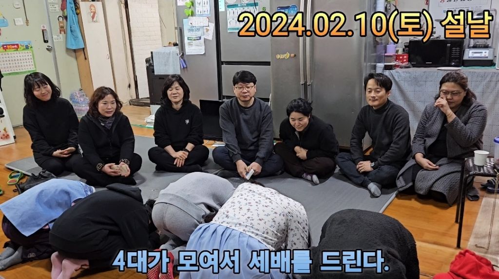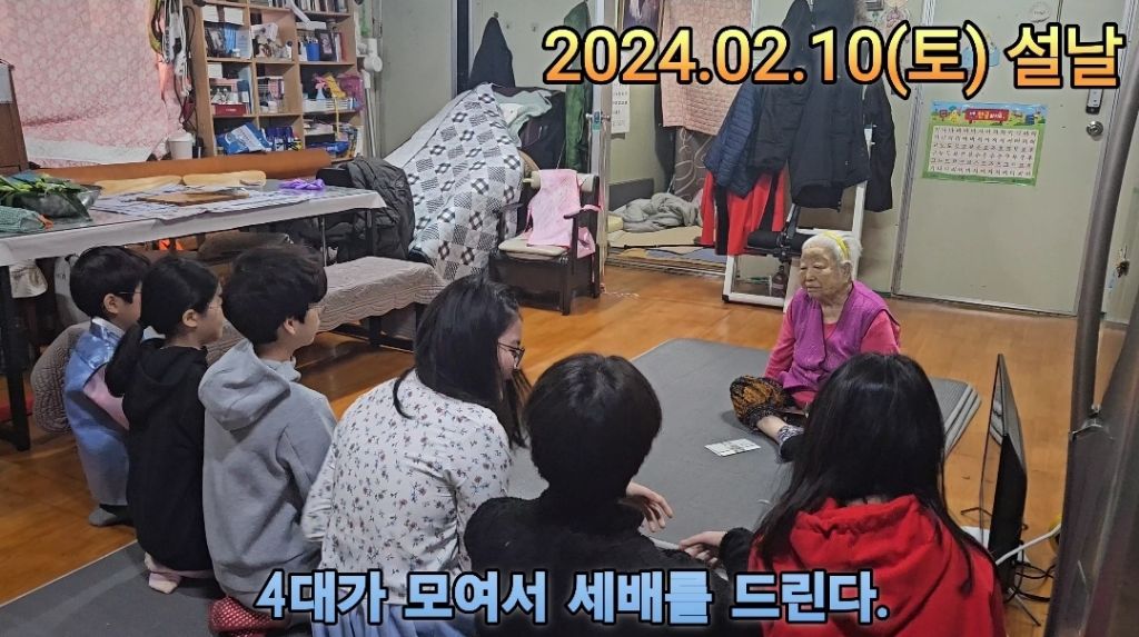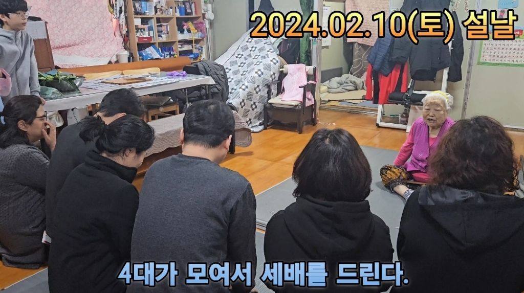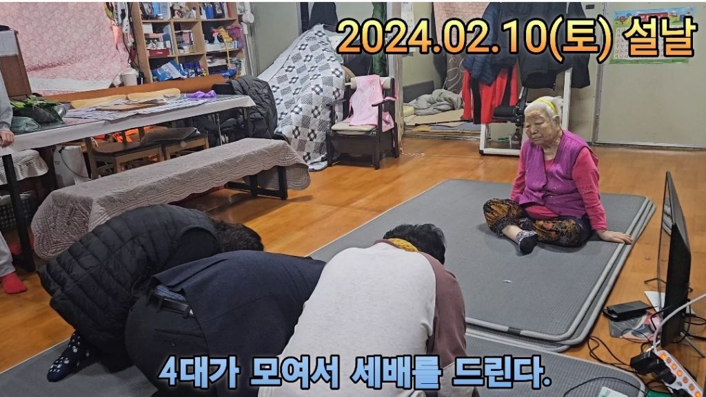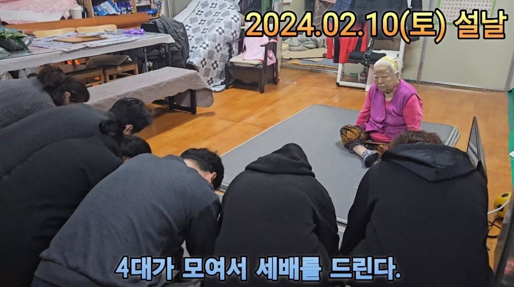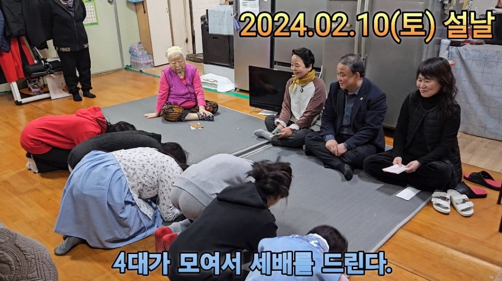 형제들이 엄마에게, 손주들이 할머니에게, 증손주들이 증조할머니에게 세배를 드린다.