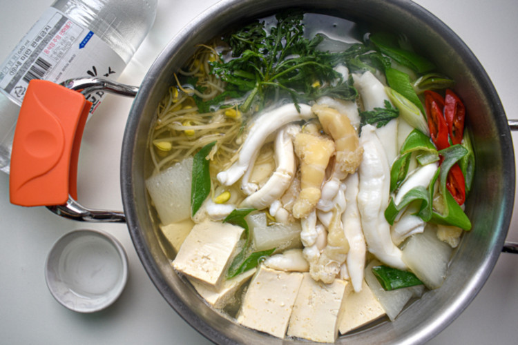 3.무 350g, 양파 1/2개, 대파 1대, 청양고추 2개, 홍고추 1개, 쑥갓을 넣고