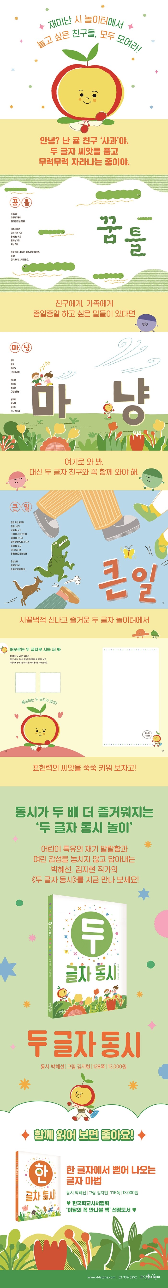 어린이 특유의 재기 발랄함과 여린 감성을 놓치지 않고 담아내는 박혜선 작가의 두 글자 동시가 찾아왔다. 이번 동시집 역시 어린이의 마음을 쉽고 재미있는 단어들로 표현하여, 보다 쉽고 만만하게 동시를 접하게 한다. ‘동시는 어려워!’라는 생각 대신, ‘동시, 꽤 재미있는걸? 나도 동시를 써 볼 수 있겠어!’라고 자신감을 북돋아 준다.