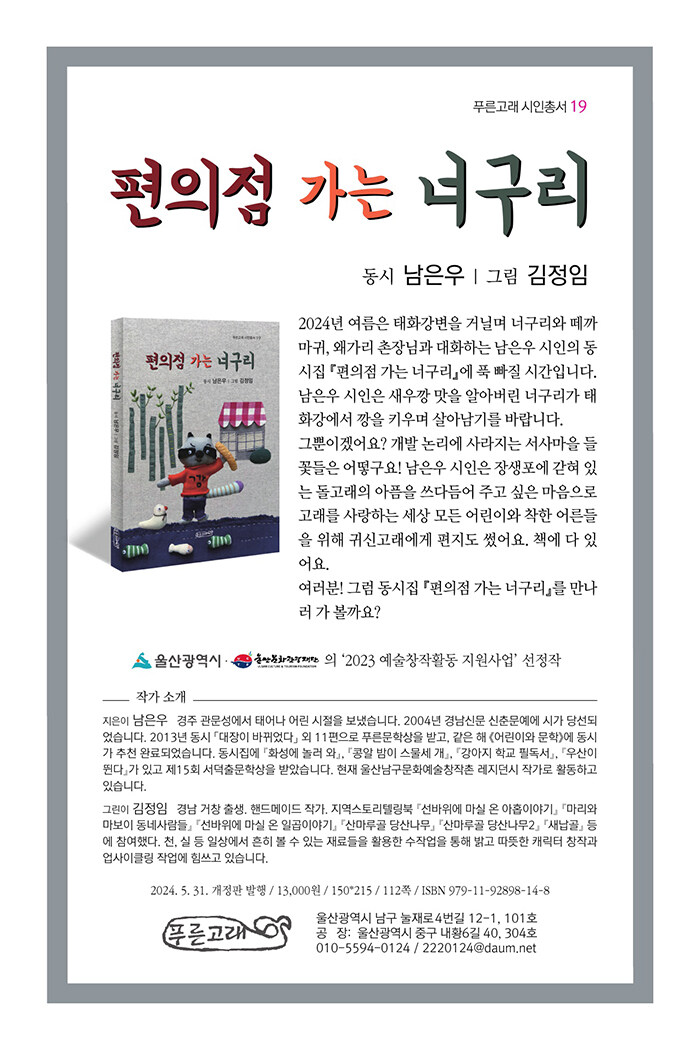 남은우 동시집 『편의점 가는 너구리』 작성자유화란|작성시간24.06.22|조회수94 목록 댓글 1 글자크기 작게가 글자크기 크게가 푸른고래 시인총서 19남은우 (지은이), 김정임 (그림) / 푸른고래 2024-05 출판사 제공 책소개<출처>: 알라딘 다음검색 현재 게시글 추가 기능 열기 북마크 공유하기 신고 센터로 신고 댓글 댓글 1 댓글쓰기 답글쓰기 댓글 리스트 작성자신여다야 | 작성시간 24.06.23 아!!!!!!새우깡 맛을 알아버린 너구리아름다운 태화강에서 본연의 야생 정신을 잃지 않고깡으로 살아남길 진심으로 바랍니다. 출간 축하드립니다. 선생님^^ 댓글 전체보기
