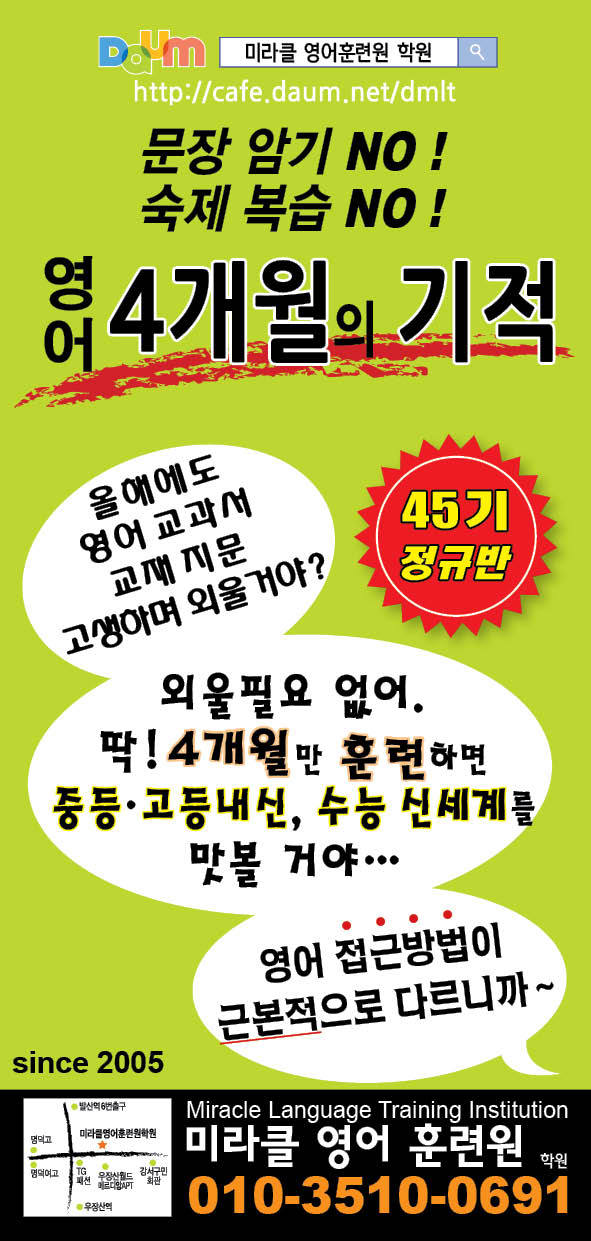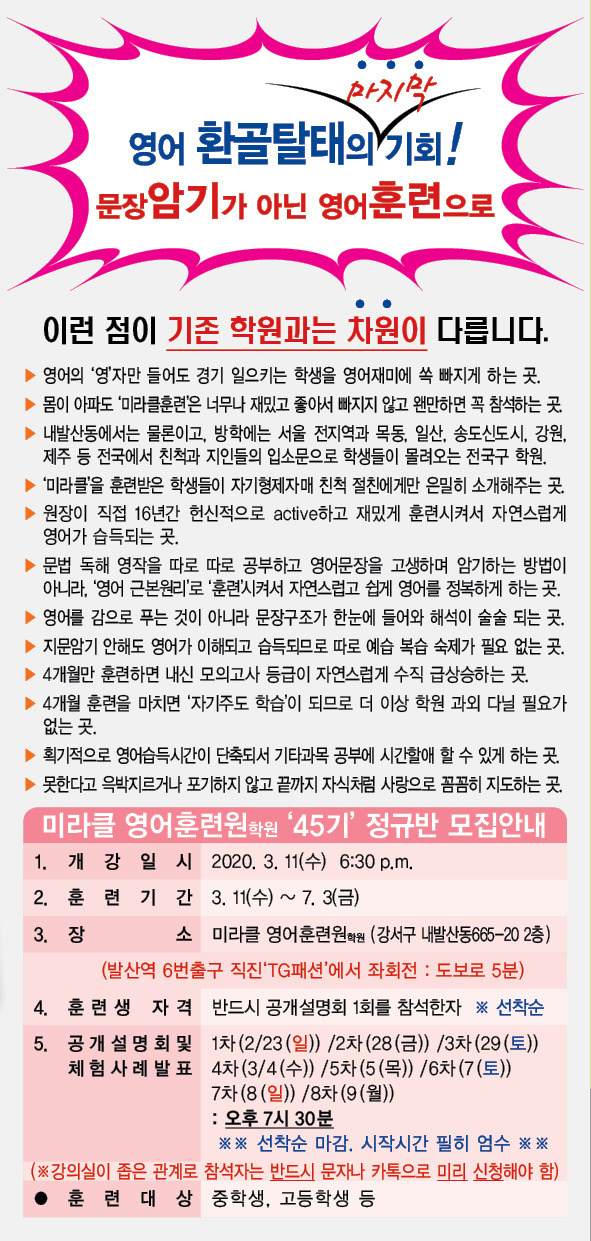 5. 장 소 : 미라클 영어 훈련원 학원(내발산동665-20 2층 / 주차장이 매우 협소합니다. 자가용 이용자는 미리 연락바람.)