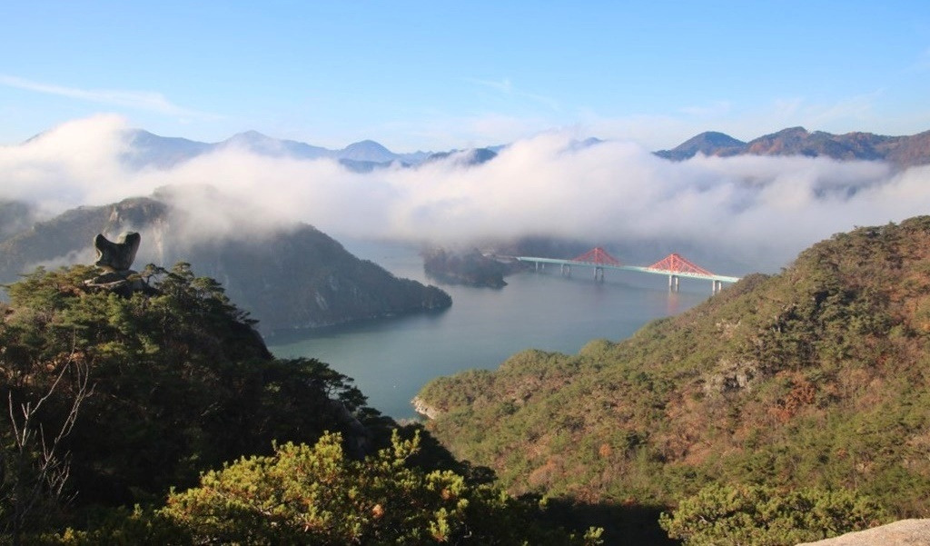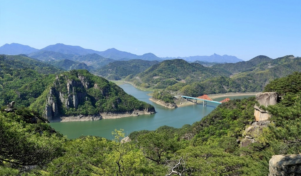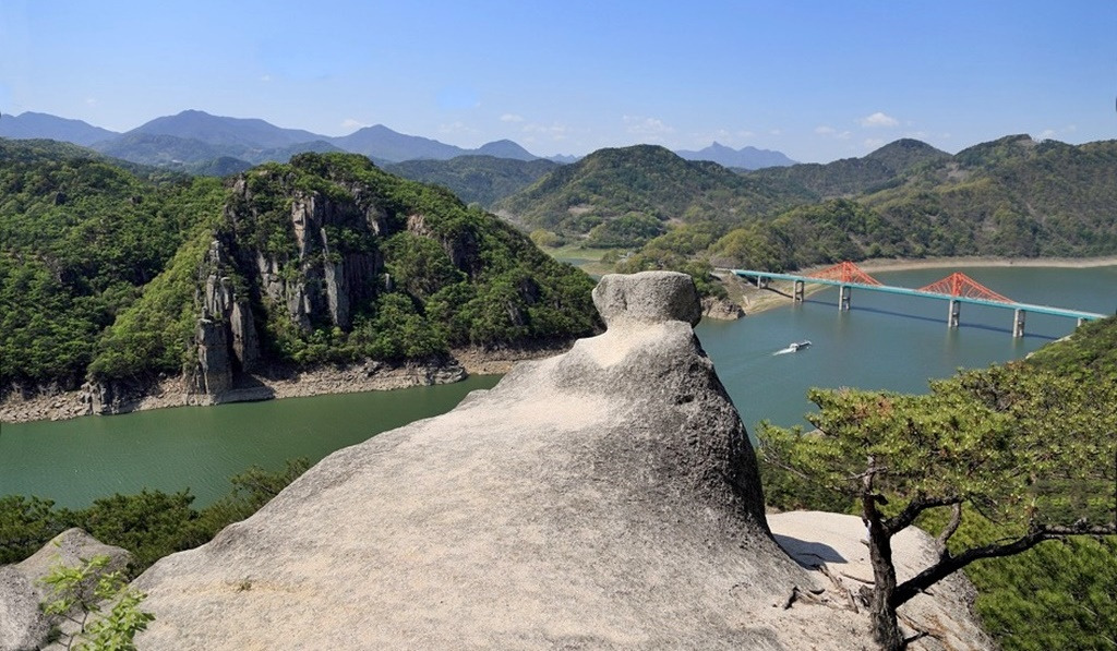 옥순봉 맞은편 가은산 가는길에 바라본 "새바위" 와 청풍호반,, 옥순대교의 모습이구요 ~