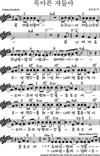 [☞찬양악보☜]목마른 자들아 누구나 내게로 오라 [유다지파 라이브] 작성자아침동산|작성시간09.09.14|조회수97 목록 댓글 0 글자크기 작게가 글자크기 크게가 목마른자들아 / 목마른자들아누구나내게로 악보 1. 목마른 자들아 누구나 내게로 나오라 나에게로 목마른 자들아 누구나 내게로 나오라 나에게로주님 말씀 하셨네 와서 마시라오 생명수 흘러 넘쳐 나의 영혼을 적시소서주의 성령의 강물 흐르소서오 생명수 흘러넘쳐 나의 영혼 적시소서주의 성령의 강물 흐르소서 흐르소서 2.3. 주의 성령의 강물 주의 성령의 강물 오 생명수 흘러 넘쳐 나의 영혼을 적시소서주의 성령의 강물 흐르소서오 생명수 흘러넘쳐 나의 영혼 적시소서주의 성령의 강물 흐르소서 흐르소서 4. 나의 영혼에 넘쳐 오 나의 영혼에 넘쳐 오오 생명수 흘러 넘쳐 나의 영혼을 적시소서주의 성령의 강물 흐르소서오 생명수 흘러넘쳐 나의 영혼 적시소서주의 성령의 강물 흐르소서 흐르소서흐르소서 흐르소서 다음검색 현재 게시글 추가 기능 열기 북마크 공유하기 신고 센터로 신고 댓글 댓글 0 댓글쓰기 답글쓰기 댓글 리스트